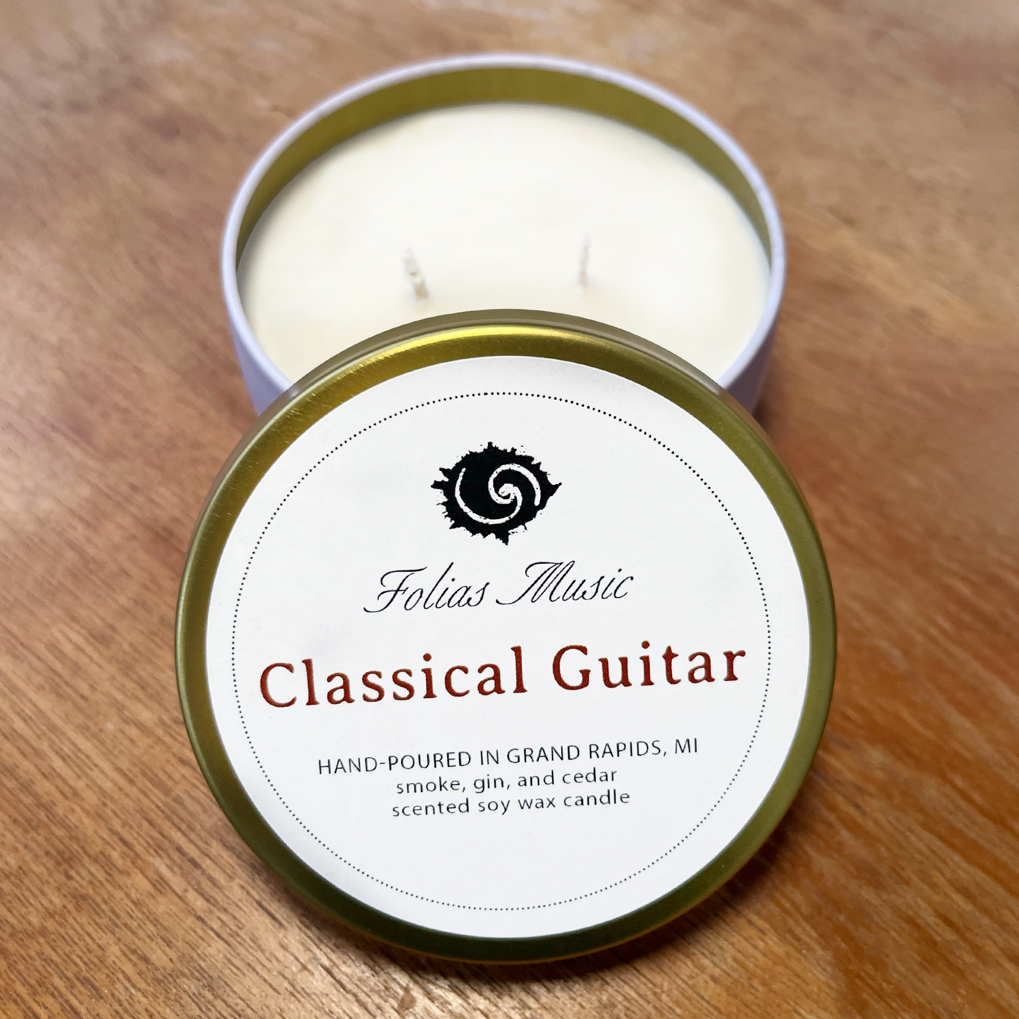 Designed by guitarist Andrew Bergeron, this hand-poured, double-wicked candle is inspired by the intimate scent world of a well-loved classical guitar. The fragrance blends smoke, gin botanicals, and warm cedar, evoking the feeling of sitting in a quiet studio surrounded by wood, strings, and creativity. Subtle smoky notes mingle with crisp juniper and the deep, resonant aroma of cedarwood—an elegant, earthy scent perfect for musicians, makers, and anyone who loves the smell of handcrafted artistry.