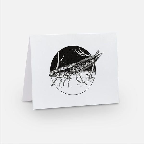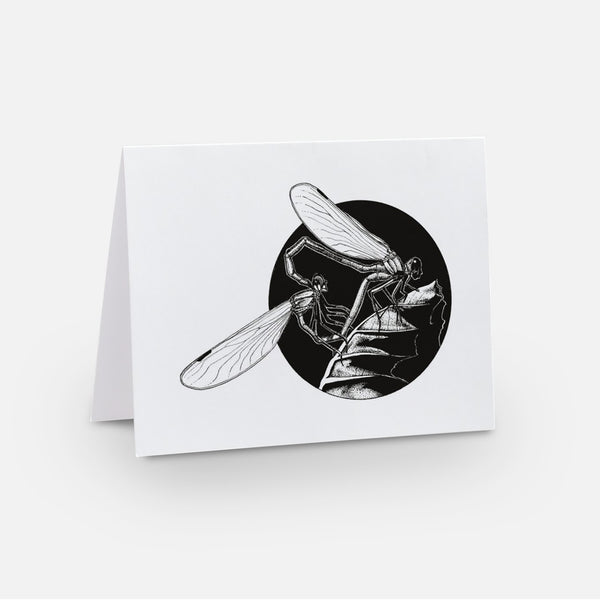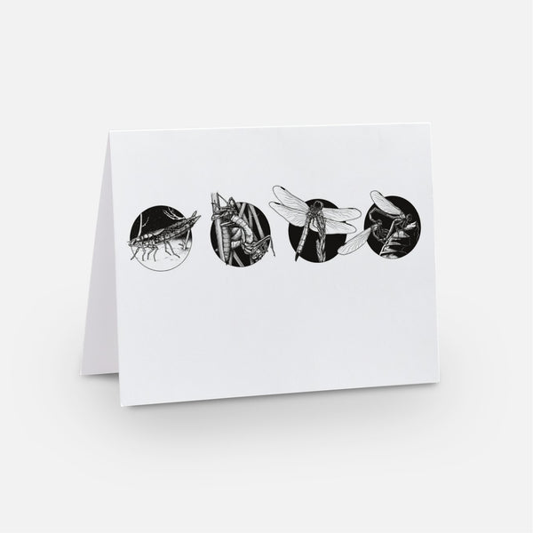 Dragonflies are among the most ancient flying insects. Interestingly, they spend most of their lives underwater! This notecard set, featuring five card illustrations created in pen by artist David McKie, showcases the dragonfly's life cycle: Aquatic, Flying, Molting, and Heartdance. Each card complements the Dragonfly set of music on the Heartdance album.